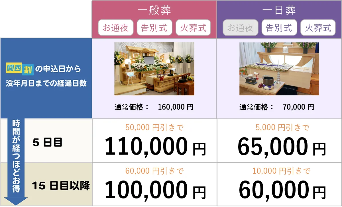 ・関西割のお申込日において、お葬式のタイプ(『一日葬』又は『一般葬』)が決まっていなくてもお申し込みは可能です。