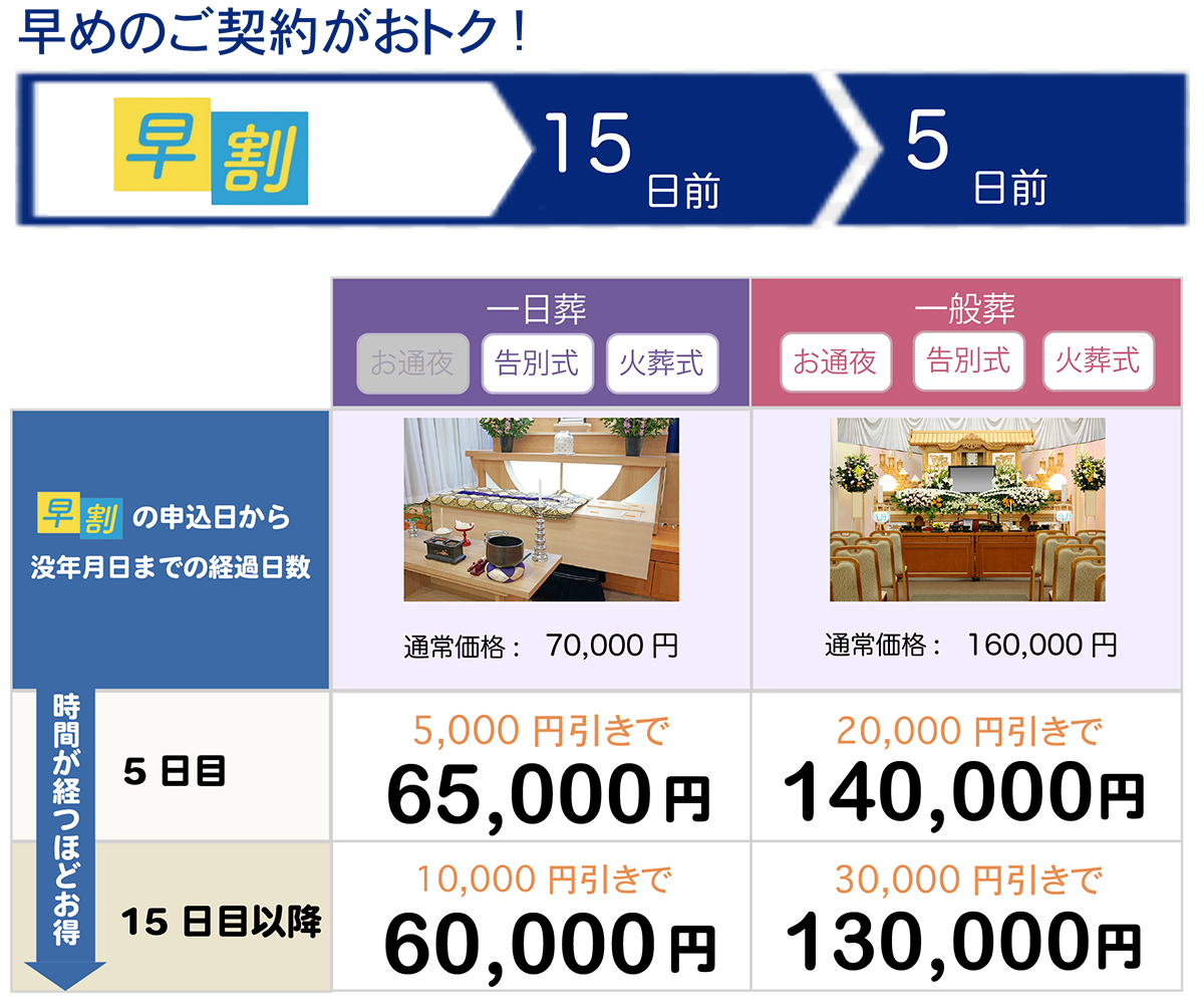 ・早割のお申込日において、お葬式のタイプ(『一日葬』又は『一般葬』)が決まっていなくてもお申込みは可能です。